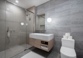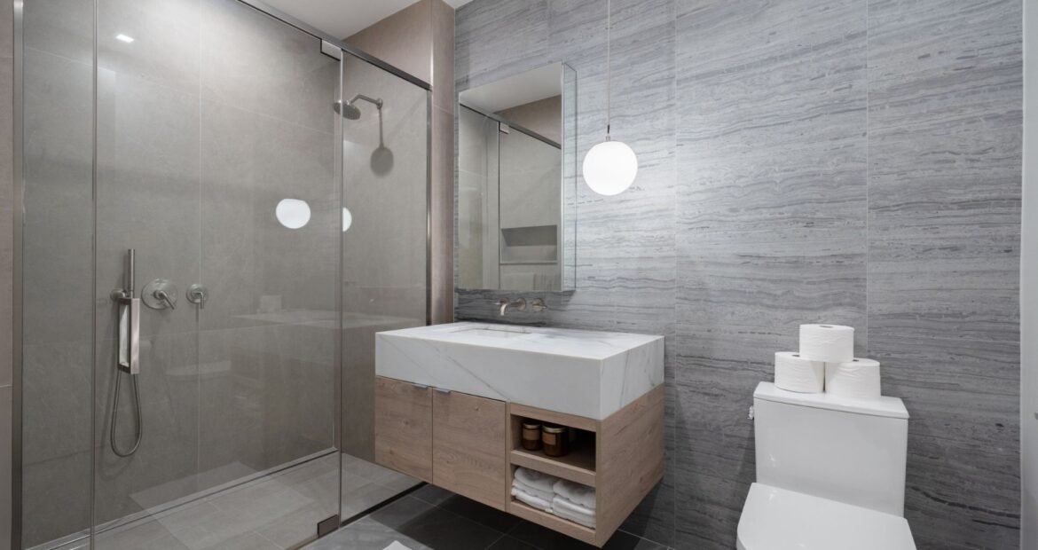Expanded Glass-Enclosed Rain Shower w/ Light Grey Porcelain Tile Floor