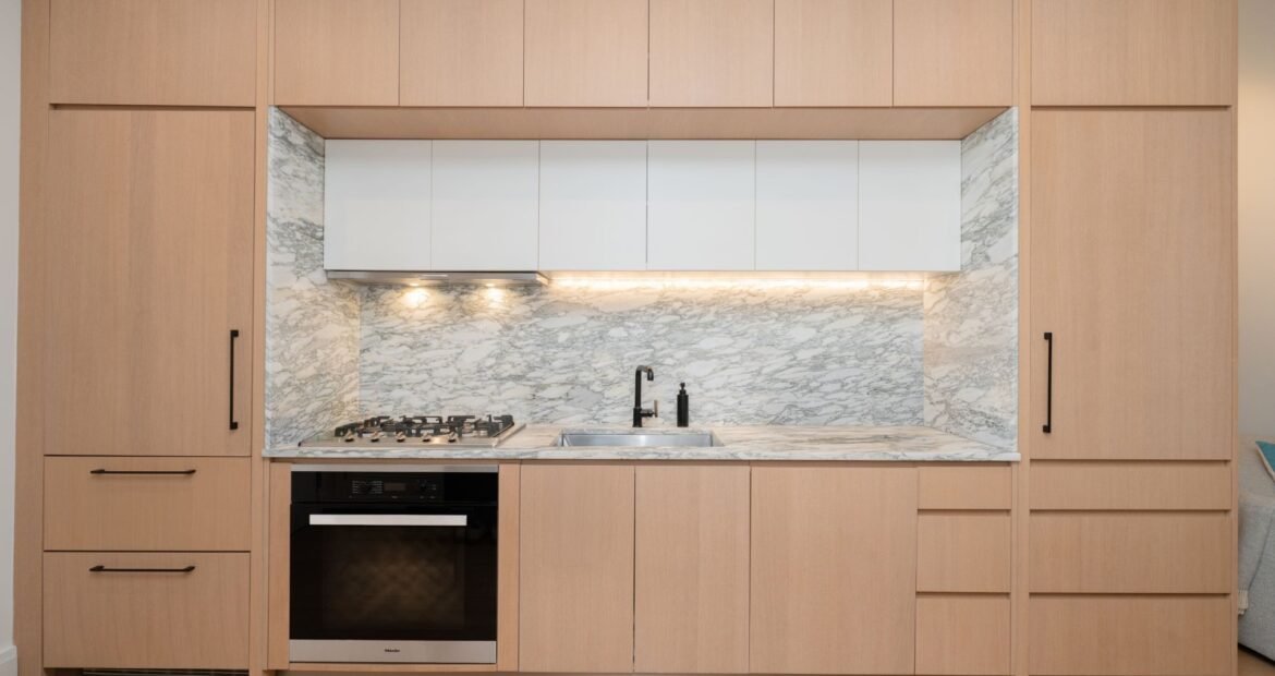 Kitchen w/ Arabescato Bluette marble countertops & backsplash
