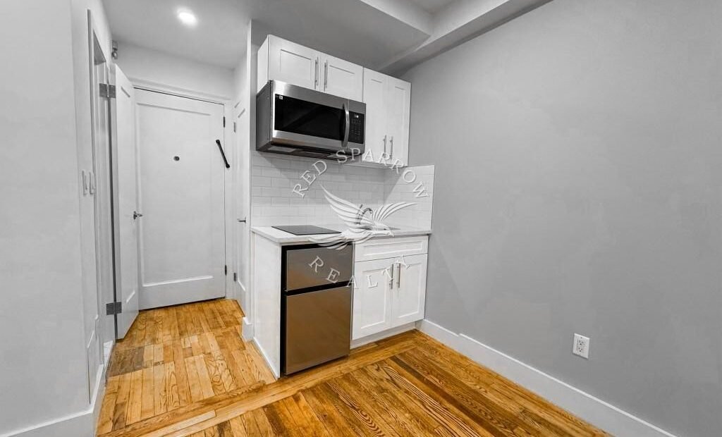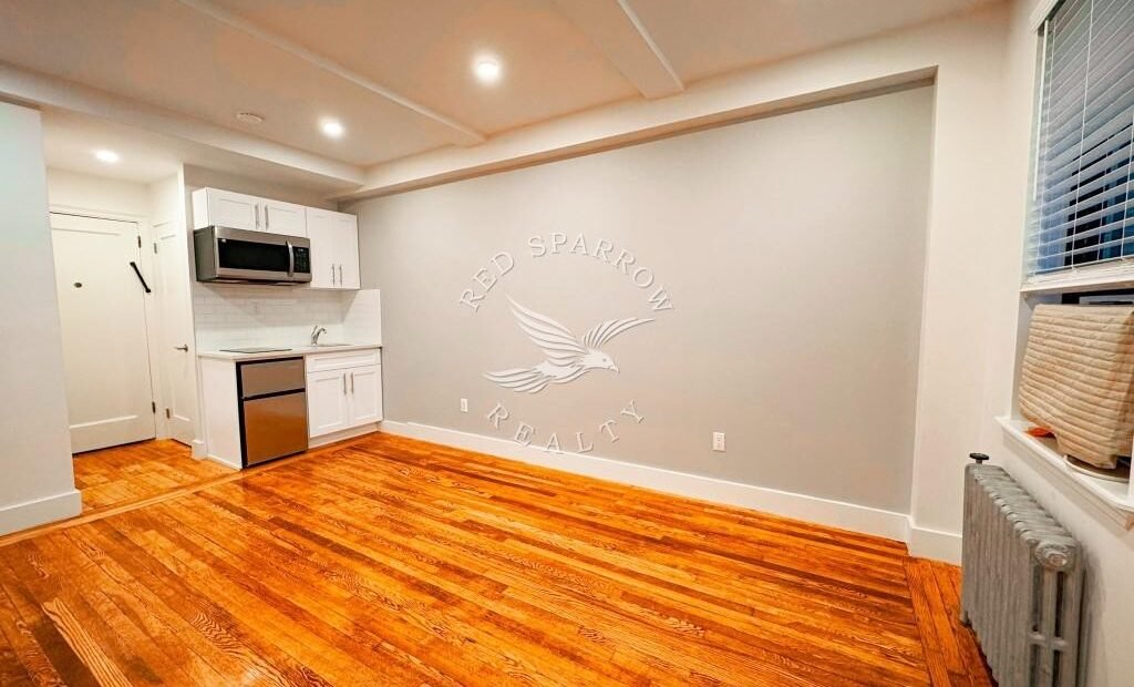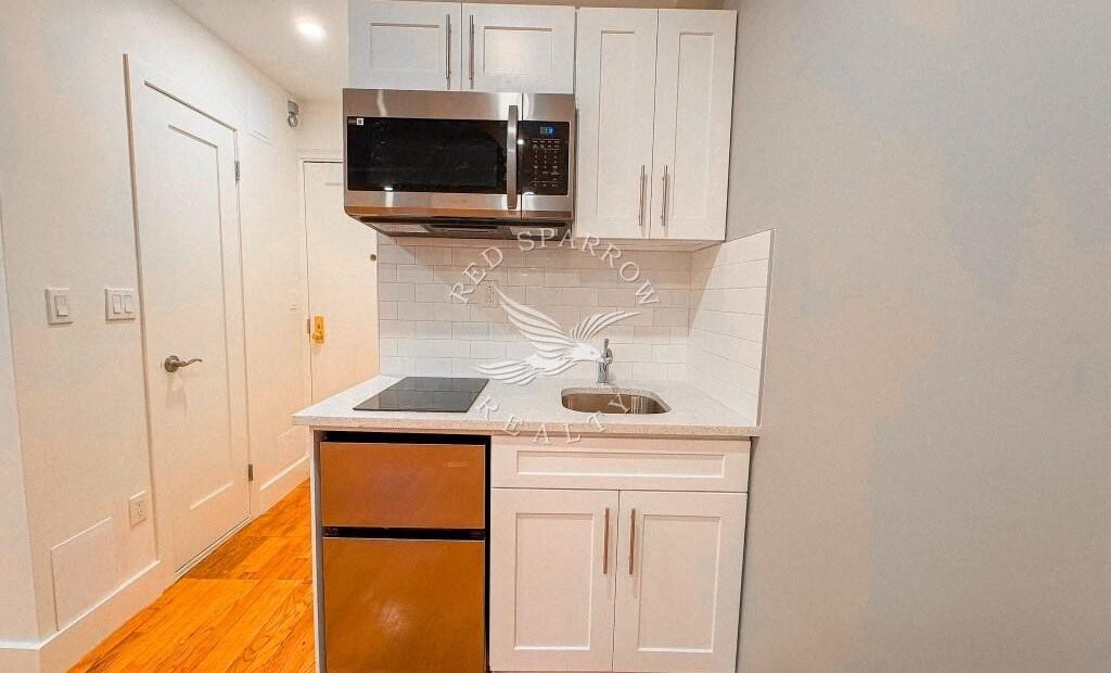 Studio with air conditioner, kitchenette, and bathroom in a 24-hour doorman building with elevator and laundry facility. #18009
