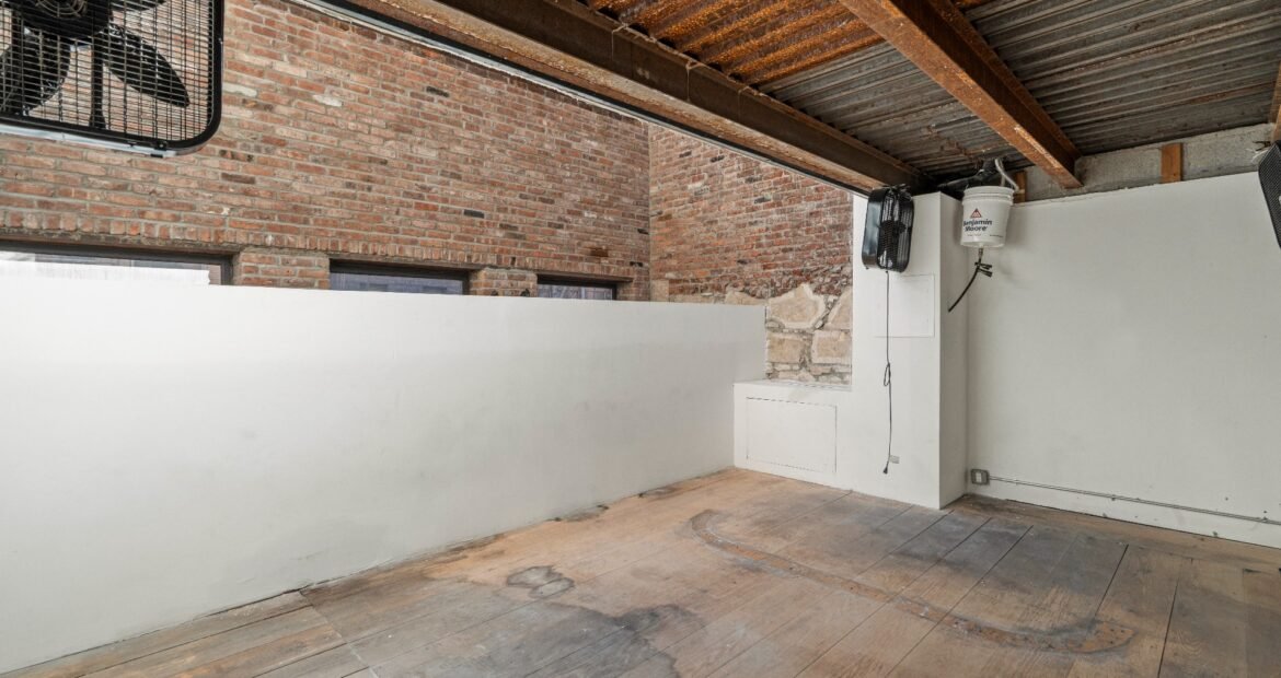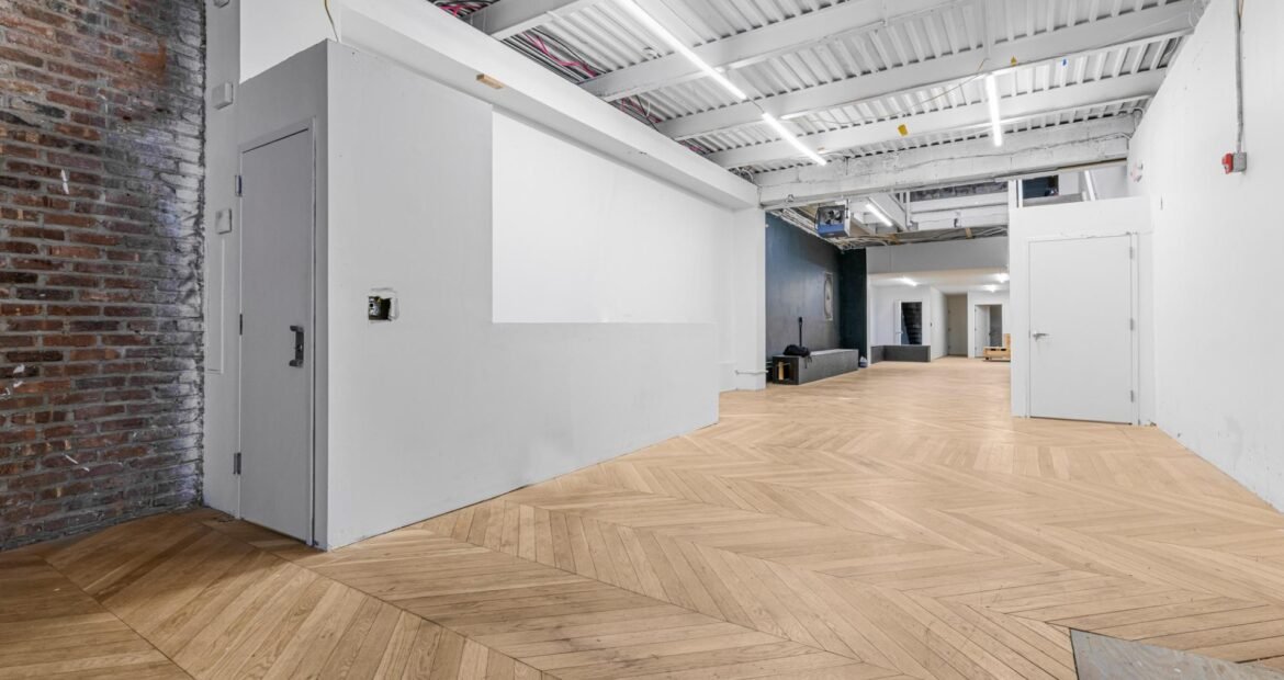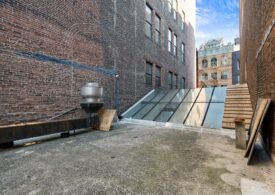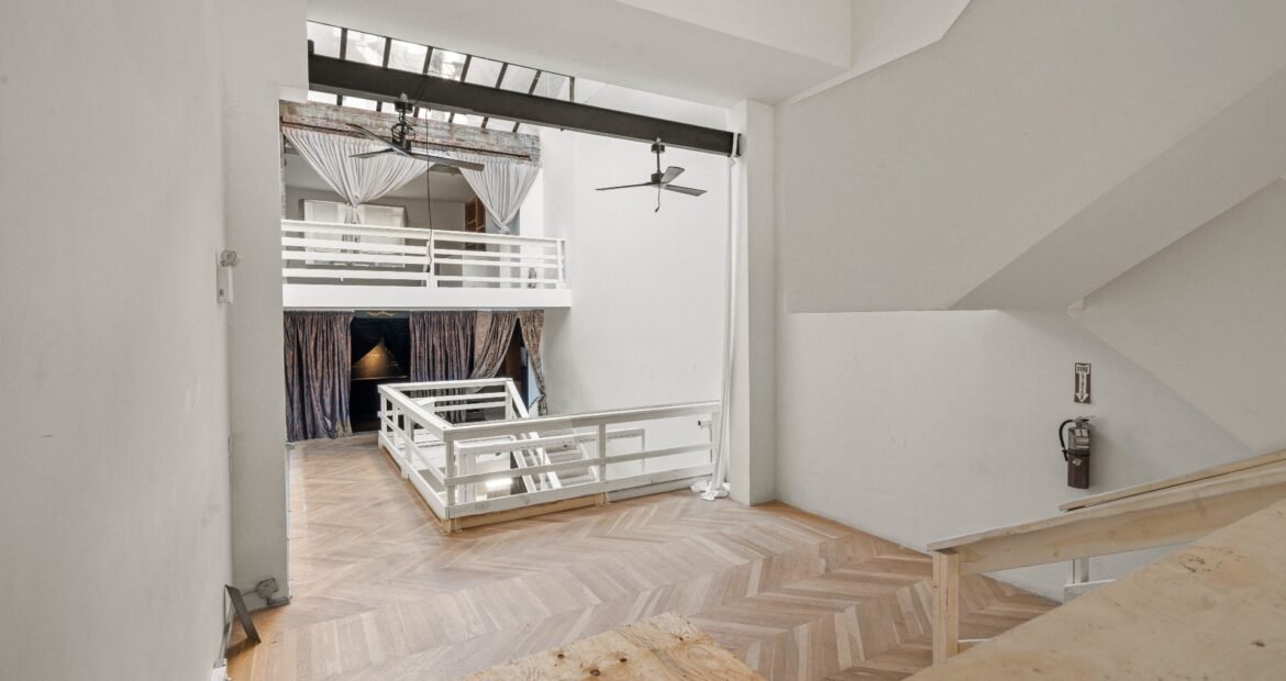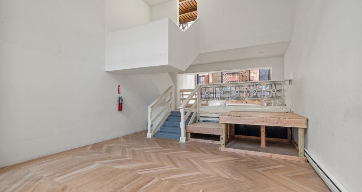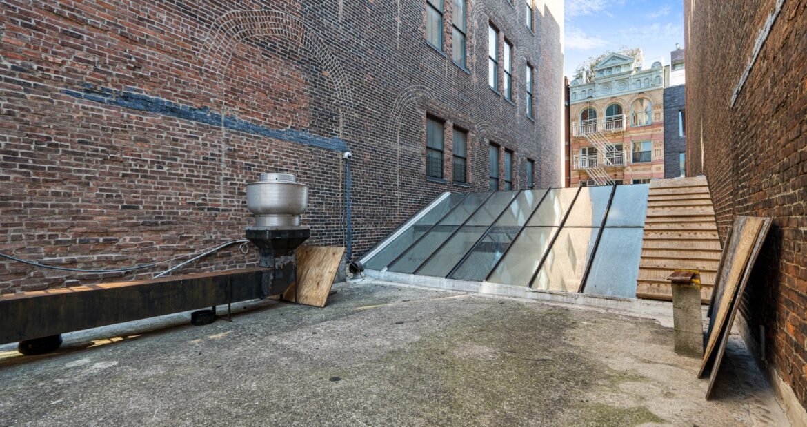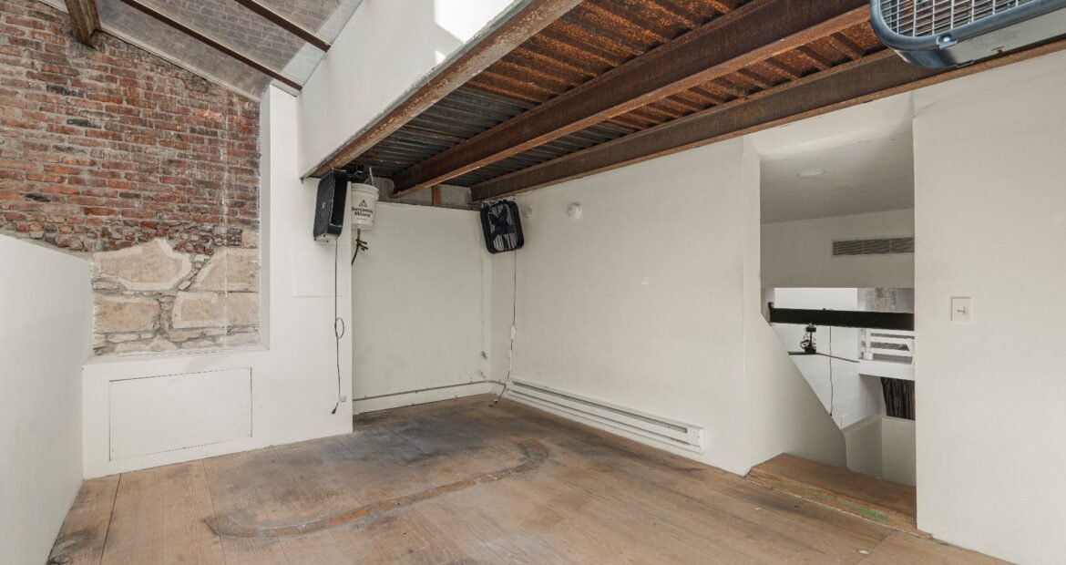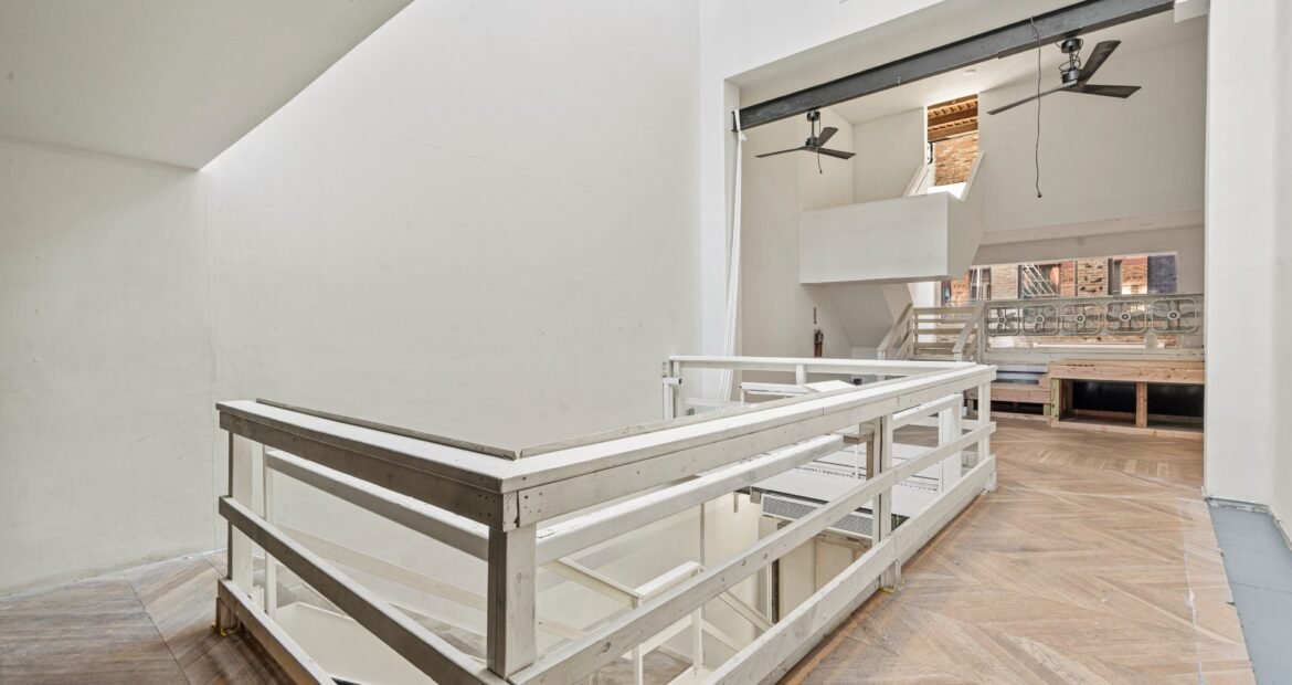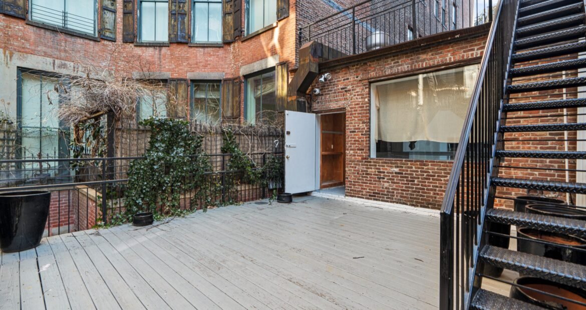 A 30 foot skylight fills the center of the space with daylight while large windows open to the surrounding cast iron streetscape. The upper floors feature open layouts with herringbone floors and lounge areas suited for gallery use or creative office needs. The lower level retains a black box atmosphere with arched brick ceilings and exposed stone that create a striking setting for exhibition or production. Two private outdoor areas complete the property. A rear terrace offers a quiet retreat and a rooftop deck reveals open skyline views.