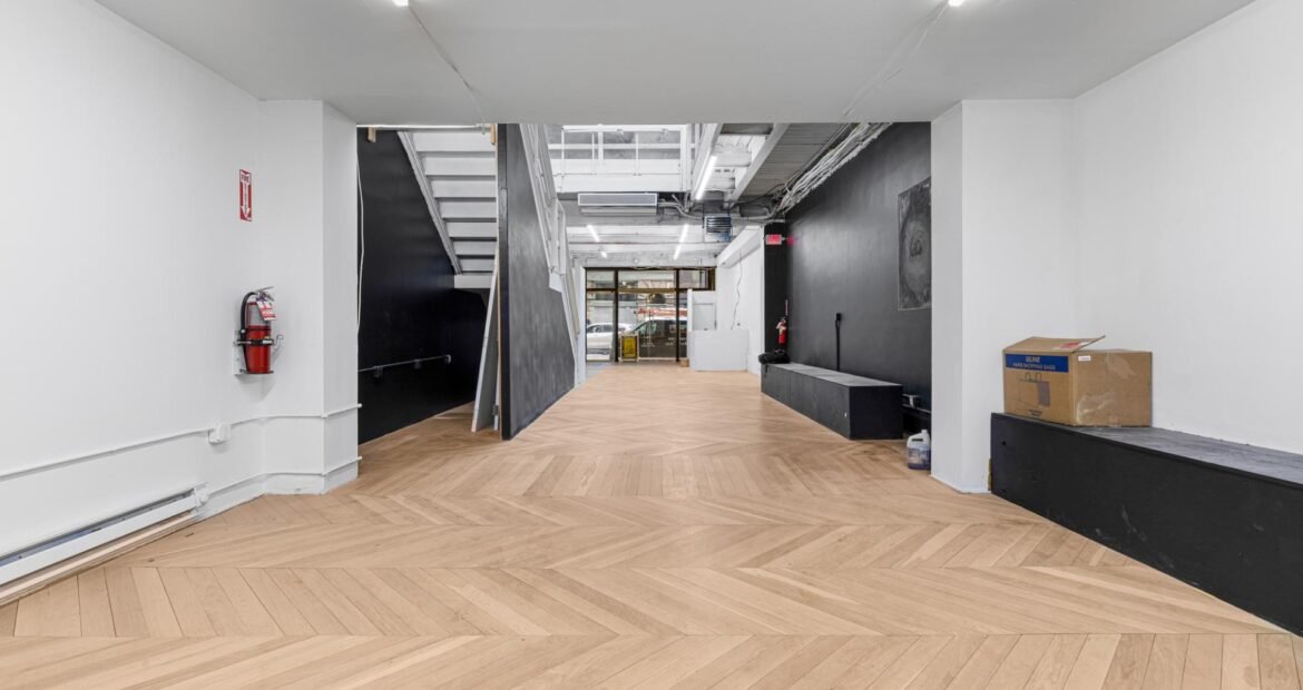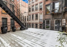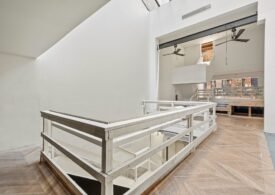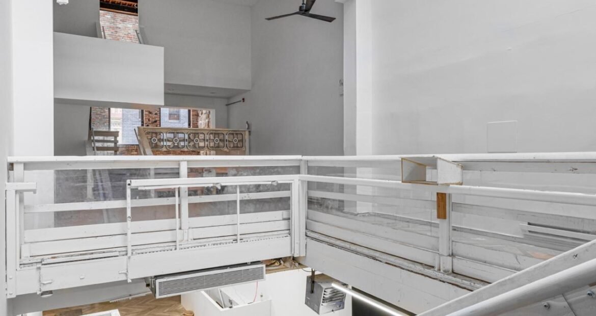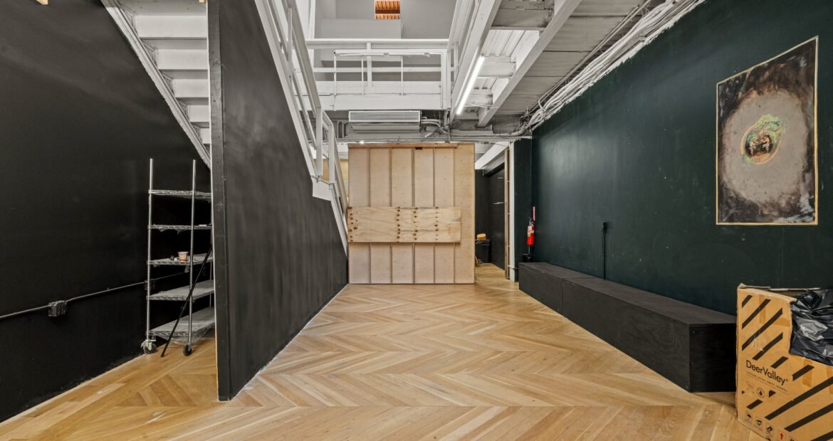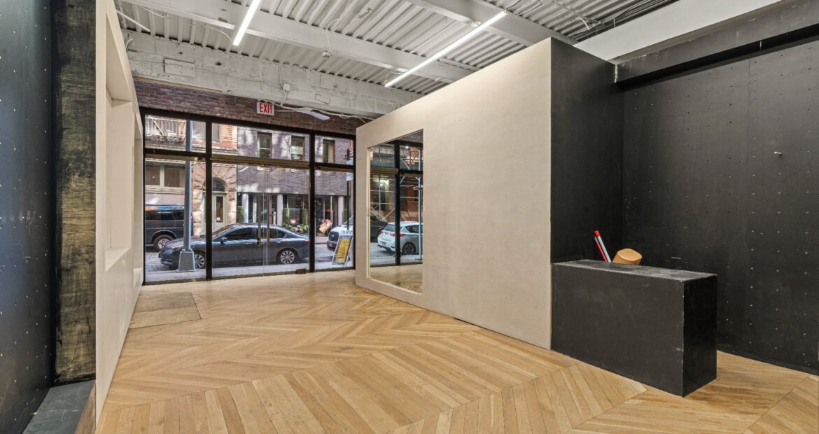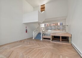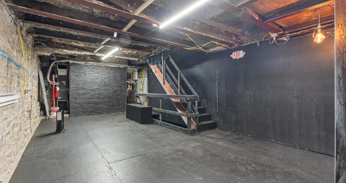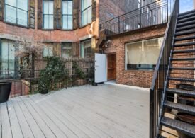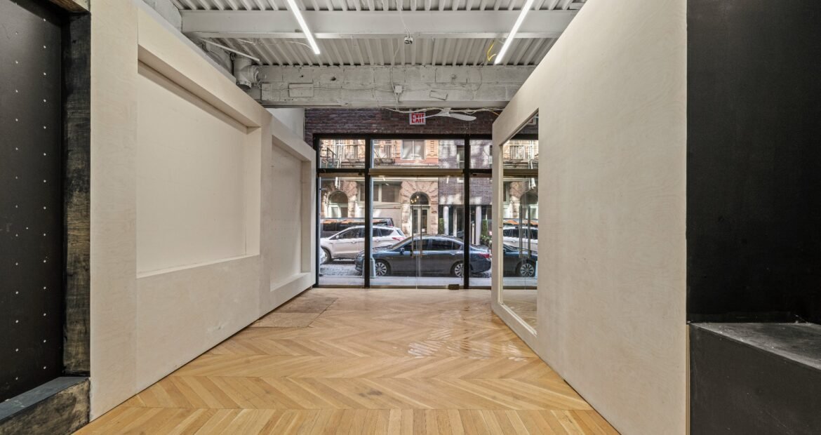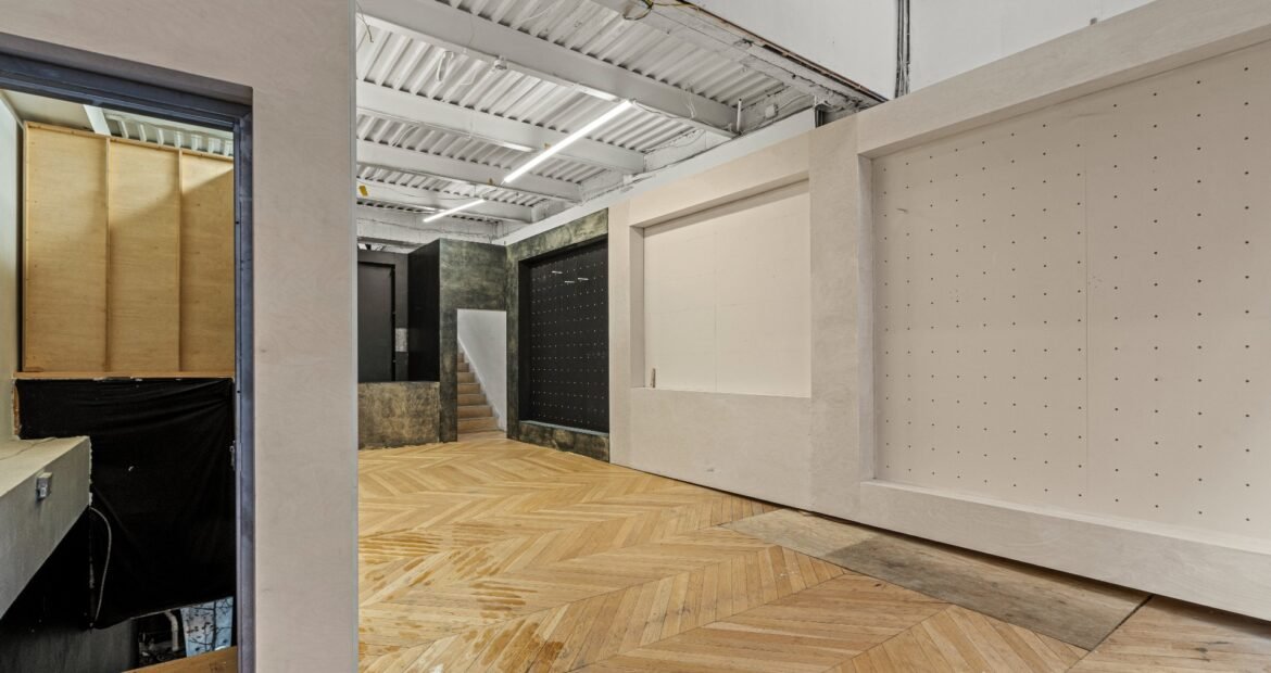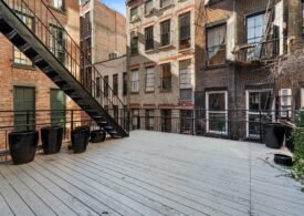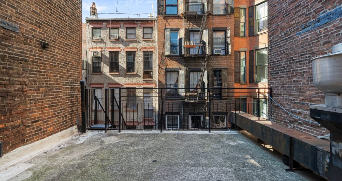 A 30 foot skylight fills the center of the space with daylight while large windows open to the surrounding cast iron streetscape. The upper floors feature open layouts with herringbone floors and lounge areas suited for gallery use or creative office needs. The lower level retains a black box atmosphere with arched brick ceilings and exposed stone that create a striking setting for exhibition or production. Two private outdoor areas complete the property. A rear terrace offers a quiet retreat and a rooftop deck reveals open skyline views.