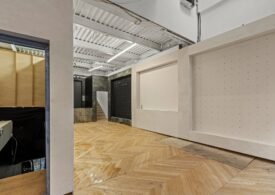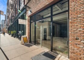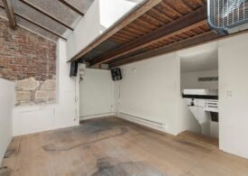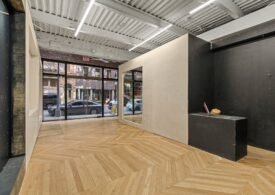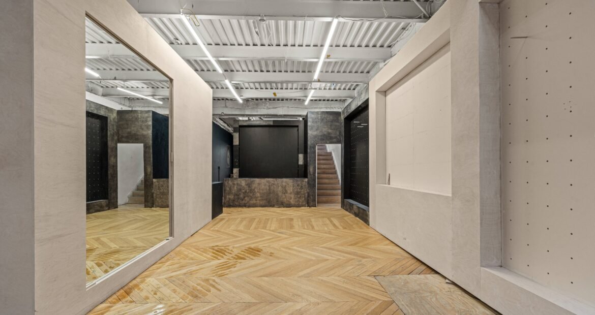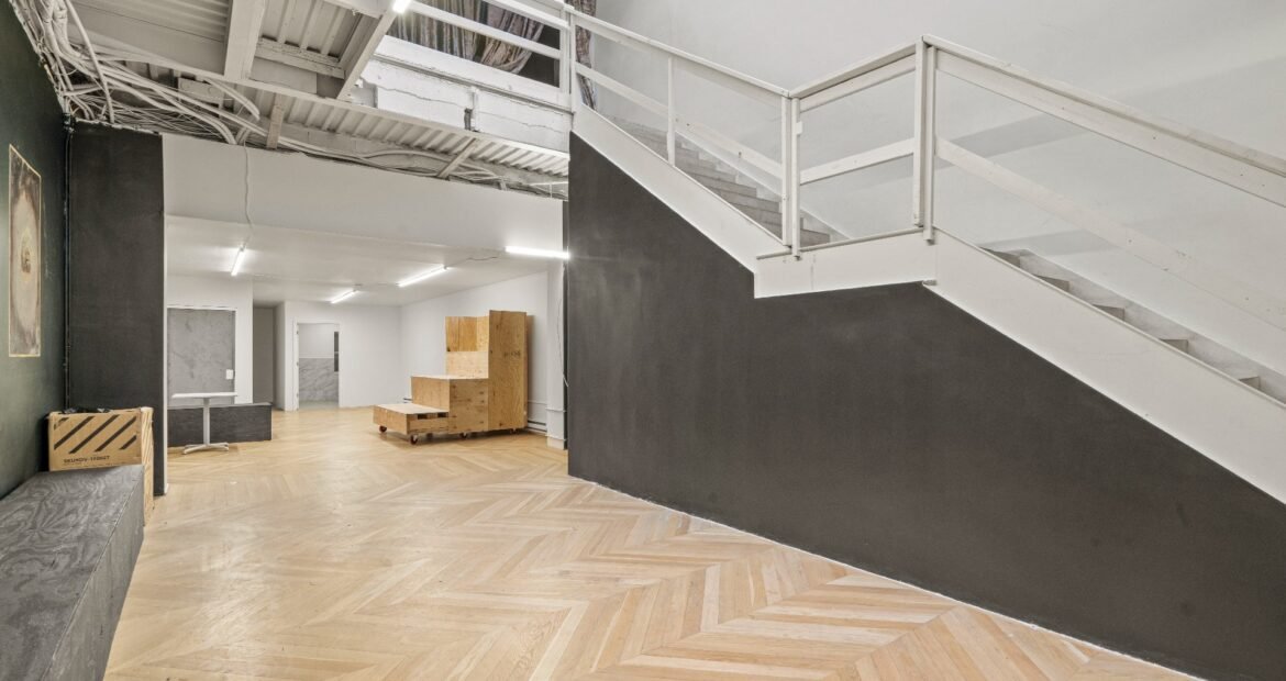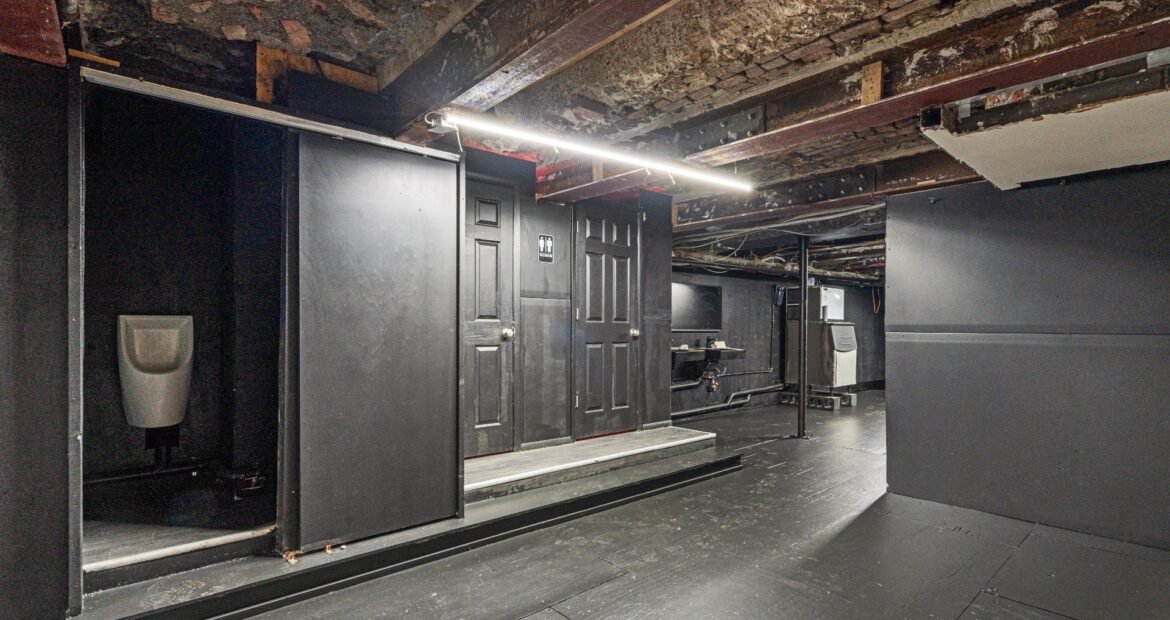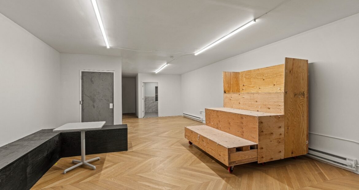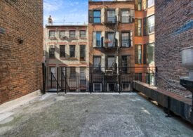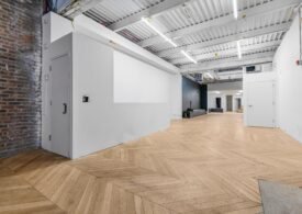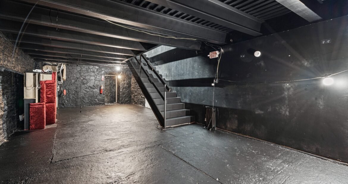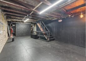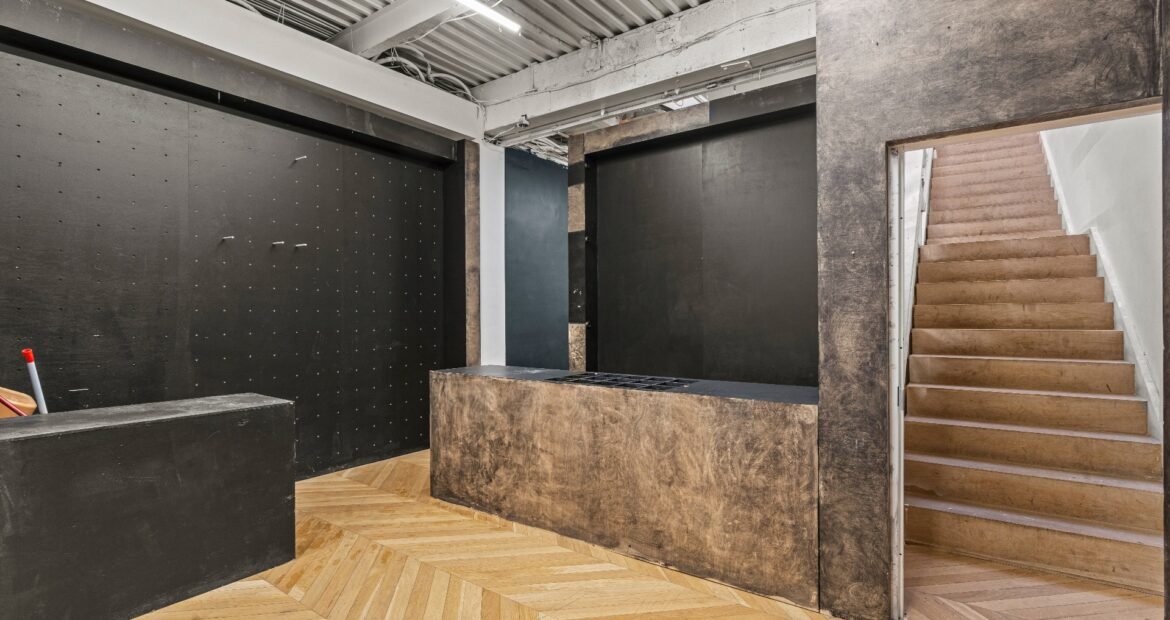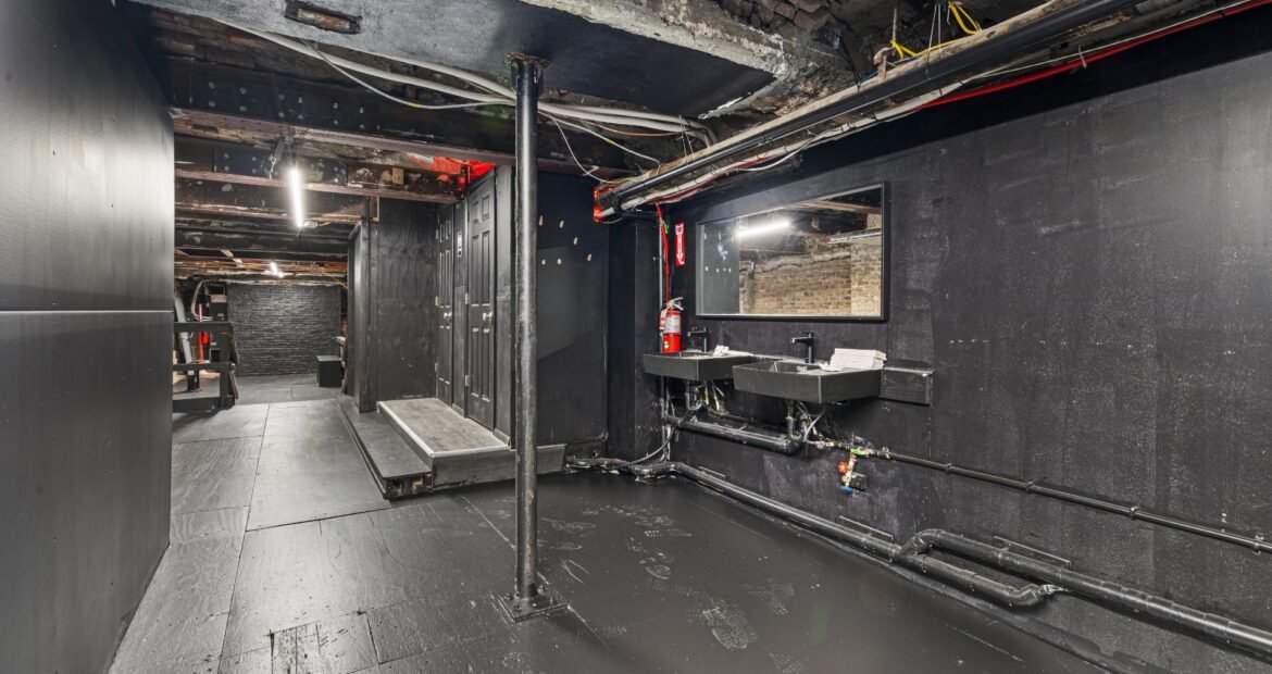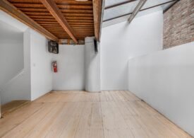 A 30 foot skylight fills the center of the space with daylight while large windows open to the surrounding cast iron streetscape. The upper floors feature open layouts with herringbone floors and lounge areas suited for gallery use or creative office needs. The lower level retains a black box atmosphere with arched brick ceilings and exposed stone that create a striking setting for exhibition or production. Two private outdoor areas complete the property. A rear terrace offers a quiet retreat and a rooftop deck reveals open skyline views.