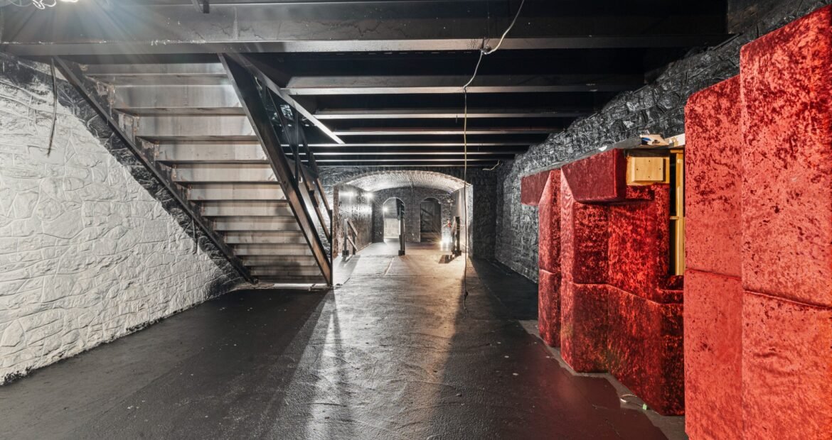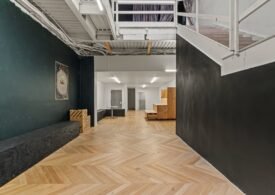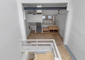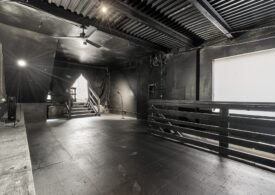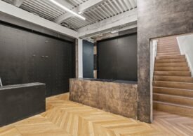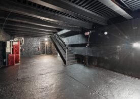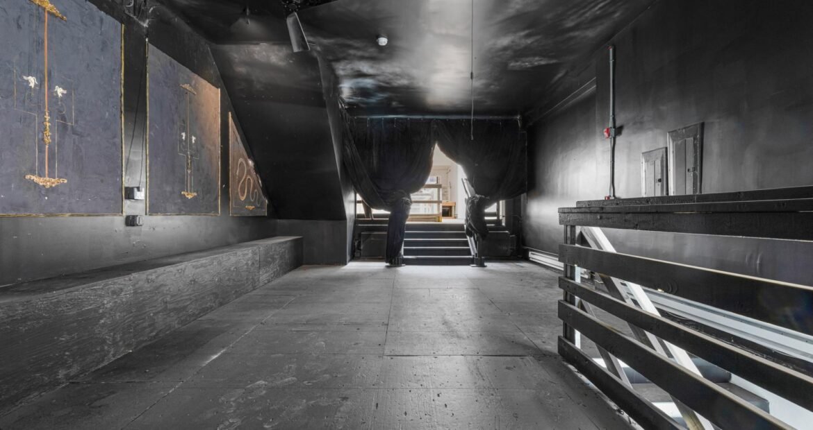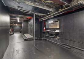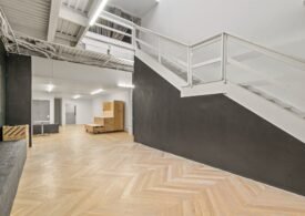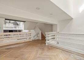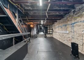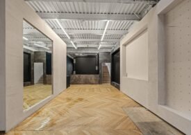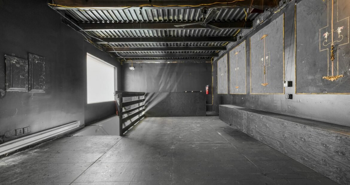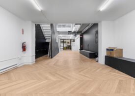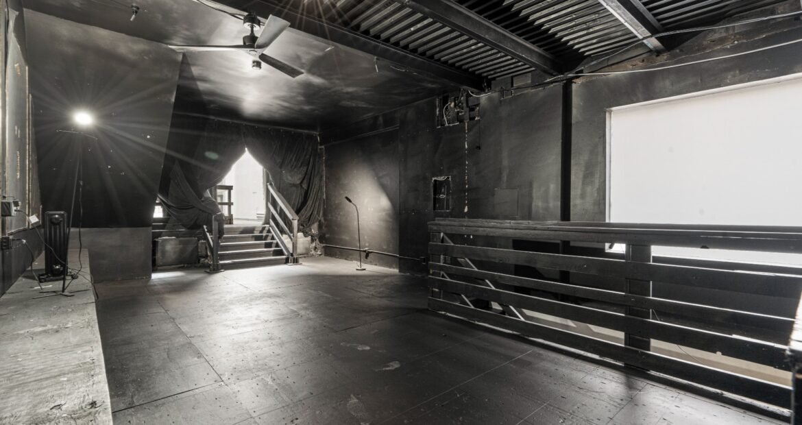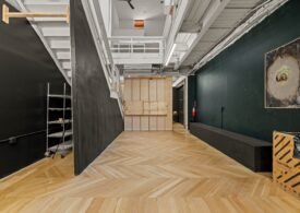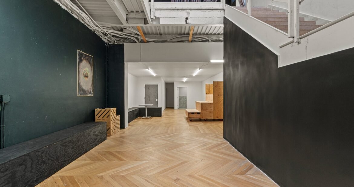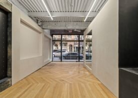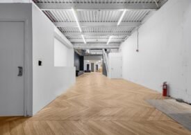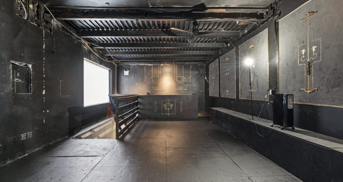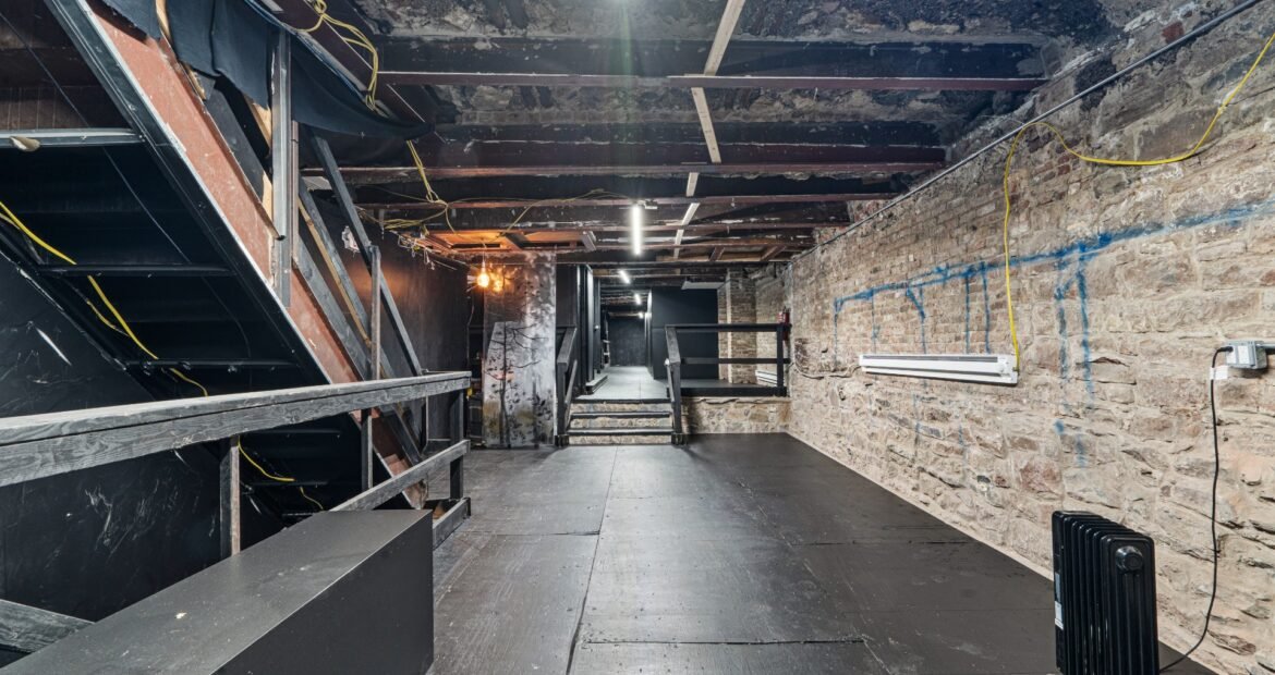 A 30 foot skylight fills the center of the space with daylight while large windows open to the surrounding cast iron streetscape. The upper floors feature open layouts with herringbone floors and lounge areas suited for gallery use or creative office needs. The lower level retains a black box atmosphere with arched brick ceilings and exposed stone that create a striking setting for exhibition or production. Two private outdoor areas complete the property. A rear terrace offers a quiet retreat and a rooftop deck reveals open skyline views.