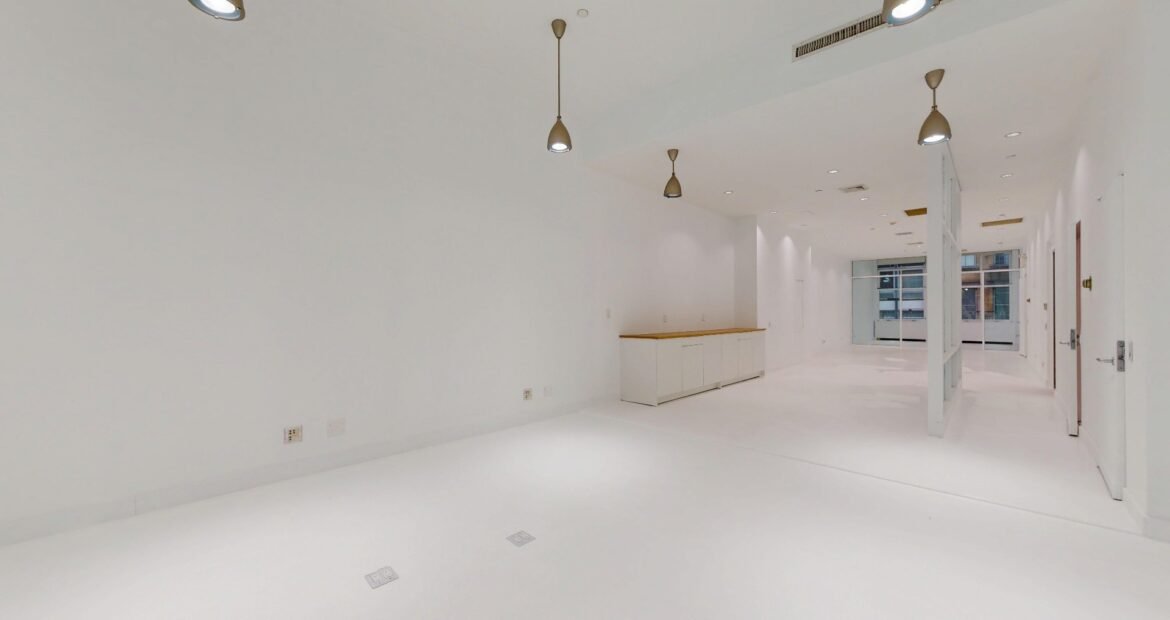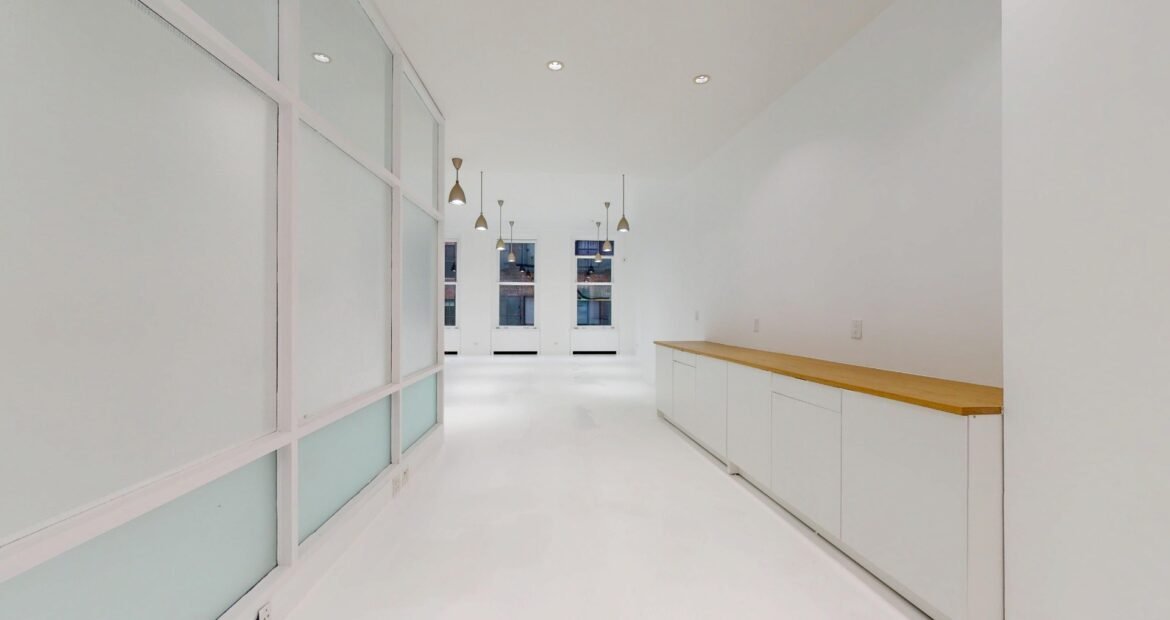 The layout reads long and efficient, with high ceilings, recessed lighting, and a sequence of full-height glass-front rooms that create real separation for meetings, private offices, and focused work while keeping the floor open and light. A wide window line at the far end anchors the space with strong natural light and classic SoHo building views, and the clean white surfaces keep the floor flexible for different brands and setups.