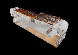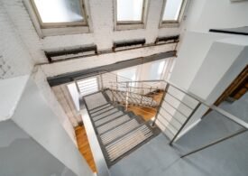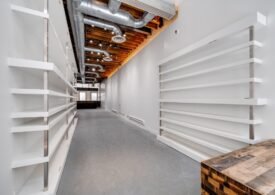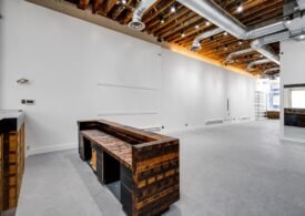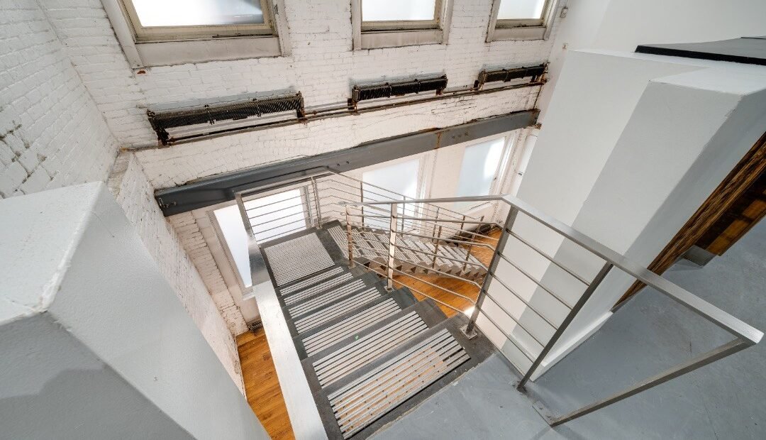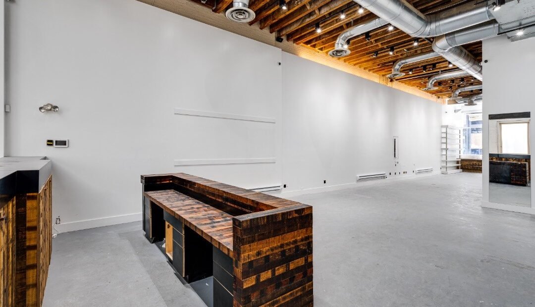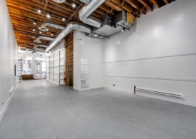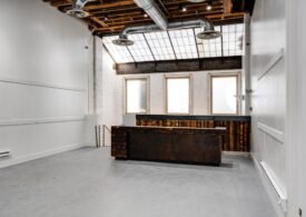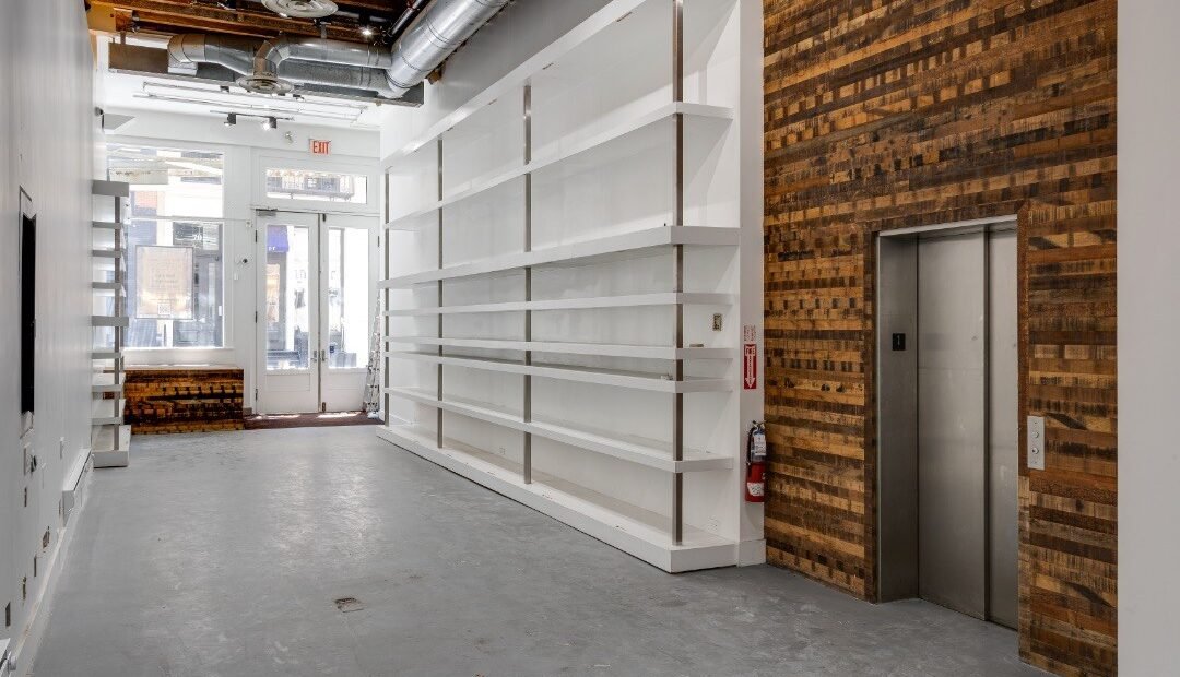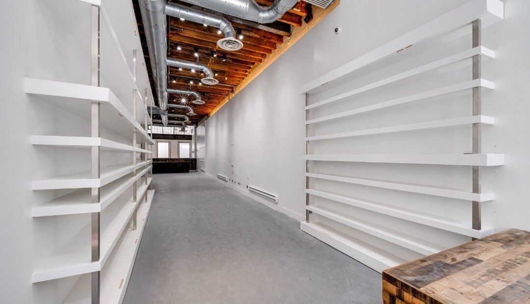 Inside, soaring 18-foot ceilings and exposed timber beams set the stage for a dramatic interior, while tall storefront windows and a custom rear skylight flood the space with natural light. Polished concrete floors, wood-paneled details, and gallery-style shelving create a refined backdrop for retail, showroom, or experiential use. A custom steel staircase and keyed elevator connect the two levels seamlessly, with the lower level fully finished and ready for flexible use.