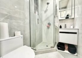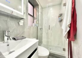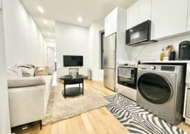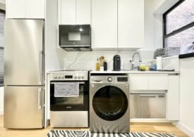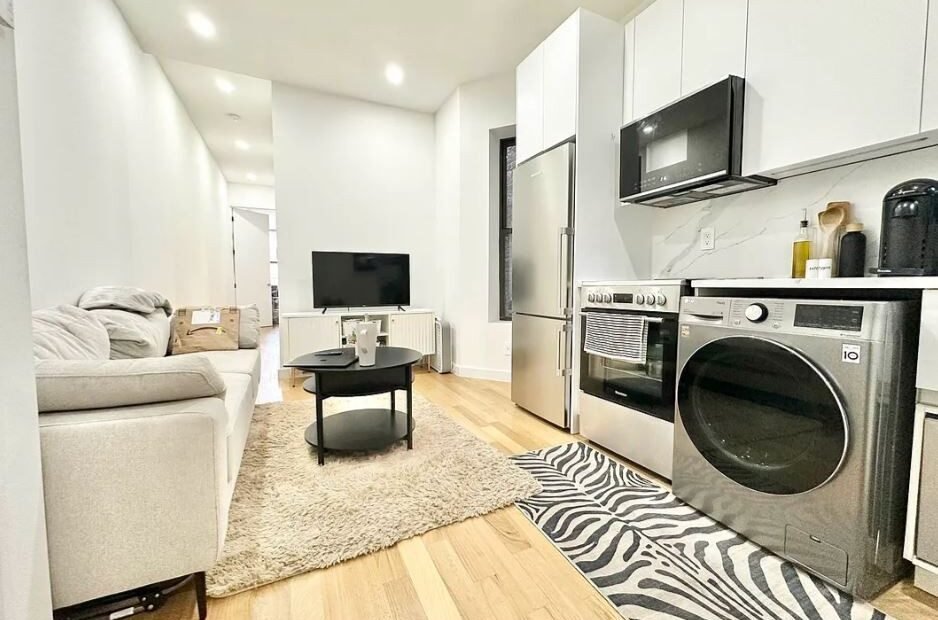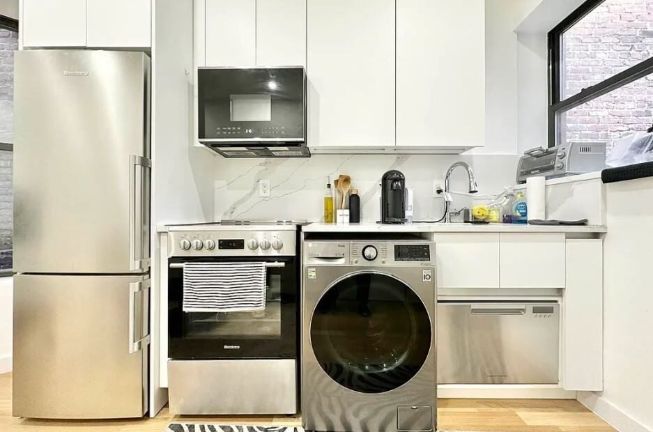 – Modern kitchen with stainless steel appliances including dishwasher and over-the-range microwave