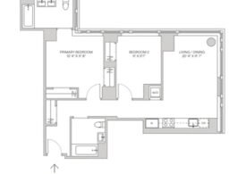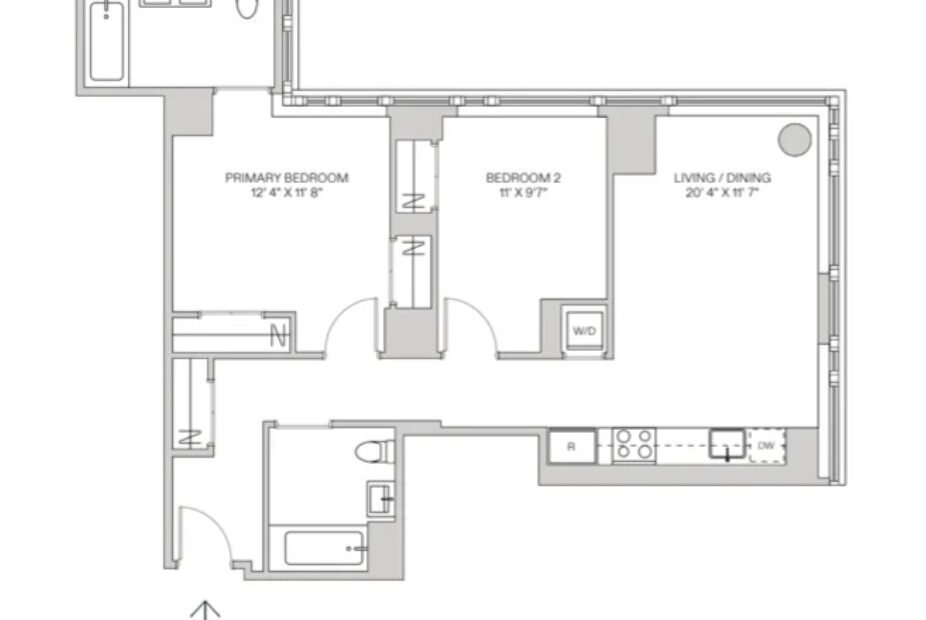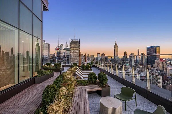 This two-bedroom, two bathroom apartment is thoughtfully designed with high-end finishes that immediately immerse you in luxury and style. The gourmet windowed kitchen is fully equipped with quartz counter-tops, beveled and polished slate subway tiling, white lacquer and ash grain cabinetry, top-of-the-line appliances and ample storage. For your additional convenience, this home is complete with an in-unit washer and dryer. The living room is quite generous in space and boasts of high ceilings with double exposure and double paned wrap around windows highlighting your impressive views of the Hudson River, Empire State building and the classic New Yorker sign. Both bedrooms will accommodate a King-size bed. The primary is complete with large windowed en-suite, double vanity and both bathrooms are outfitted with a gorgeous mosaic tile, fluted porcelain accent wall and an abundance of storage.