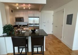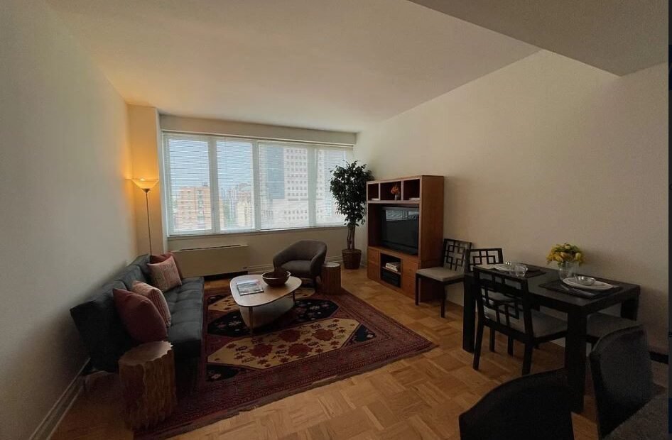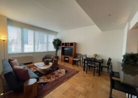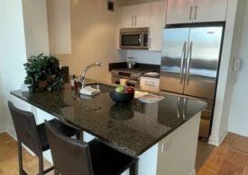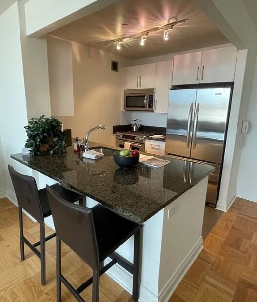 West Facing, 1 Bedroom w/ Expansive Window Walls of Triple Pane Extra Quiet Windows. Upgraded Windowed Open Loft Kitchen with Granite Counters & Expansive Dining Bar, Subway Tiled Backsplash, All Stainless Steel Appliances, Track Lighting. Bedroom with Large Customized Walk-In Closet. In Unit Washer Dryer. – Lexington Avenue #12L