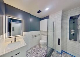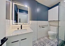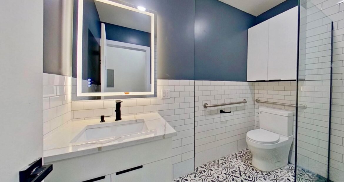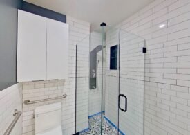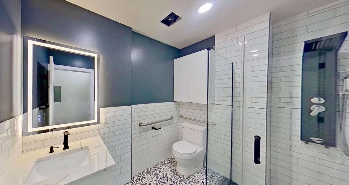 Sleek bathroom with glass rain shower