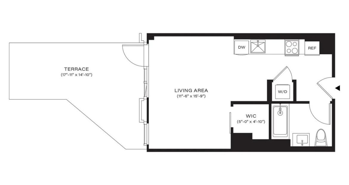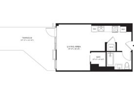 Expansive studio apartment featuring a private terrace, perfect for relaxing or entertaining outdoors. Featuring modern finishes with a cozy dining nook. Complete with the convenience of an in-unit washer & dryer and large walk in closet offering abundant storage.