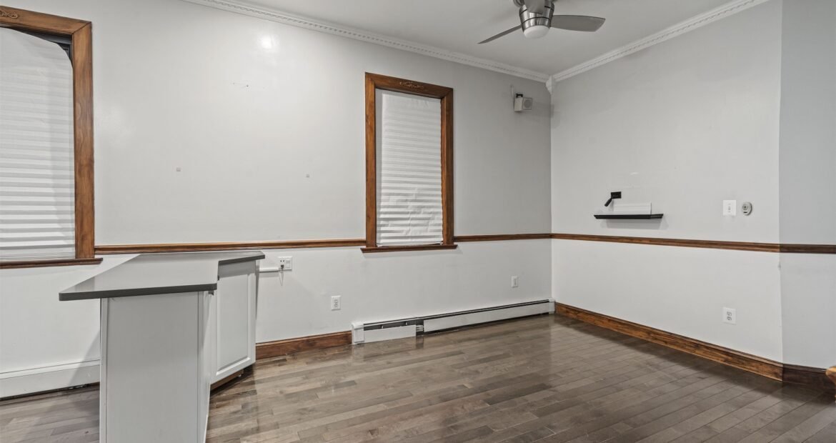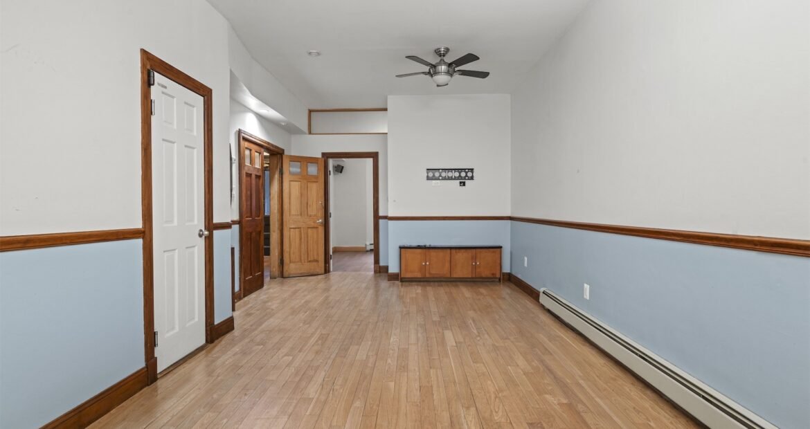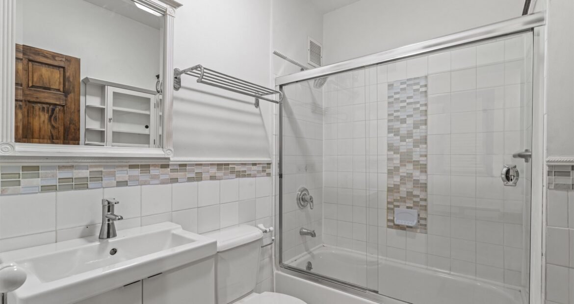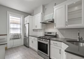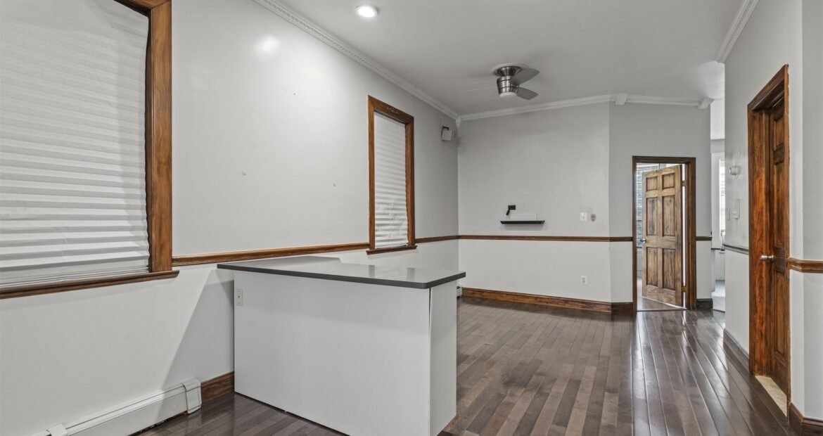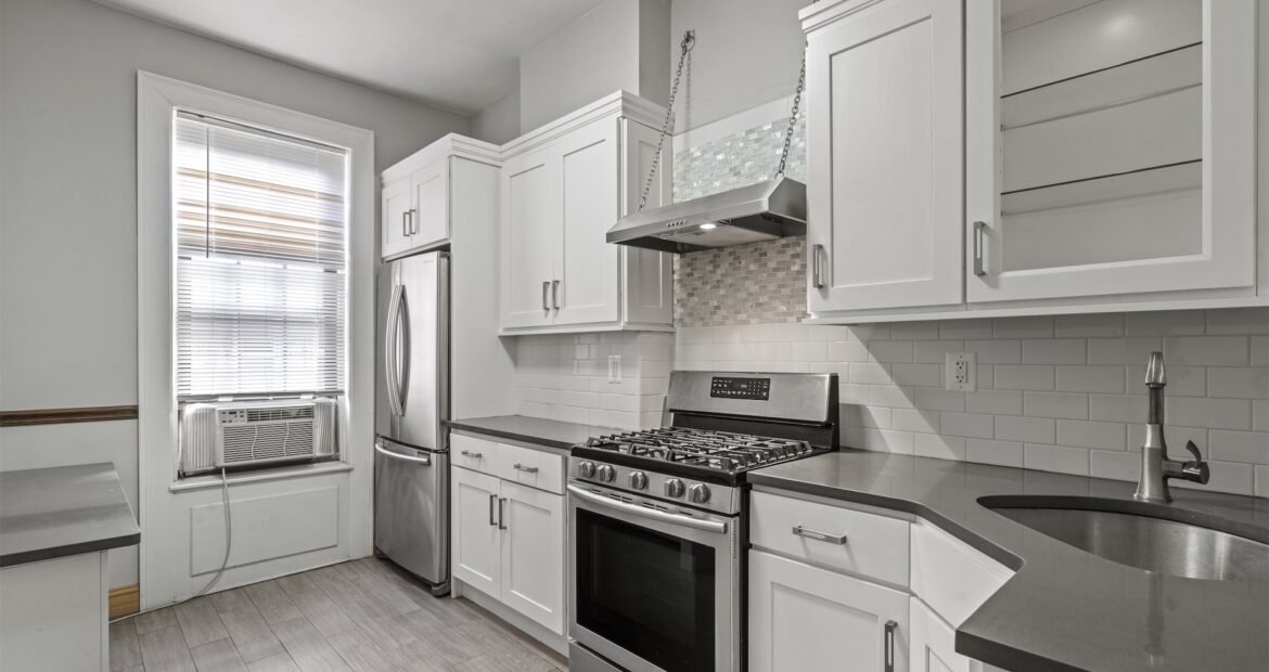 Unit 2 sits on the upper floors and carries the same level of renovation. It has hardwood floors, high ceilings, updated lighting, and a modern kitchen with stainless steel appliances and white cabinetry. The living area is bright throughout the day and the two bedrooms have clean finishes with solid window exposure. The bathroom follows the same contemporary tile design with a full tub and shower.