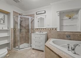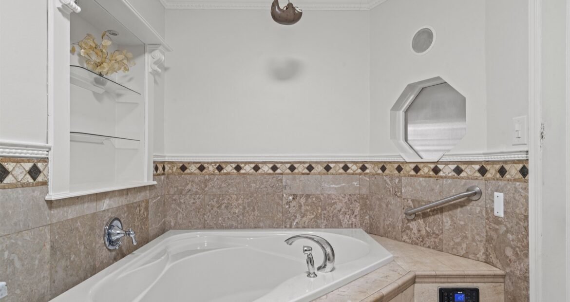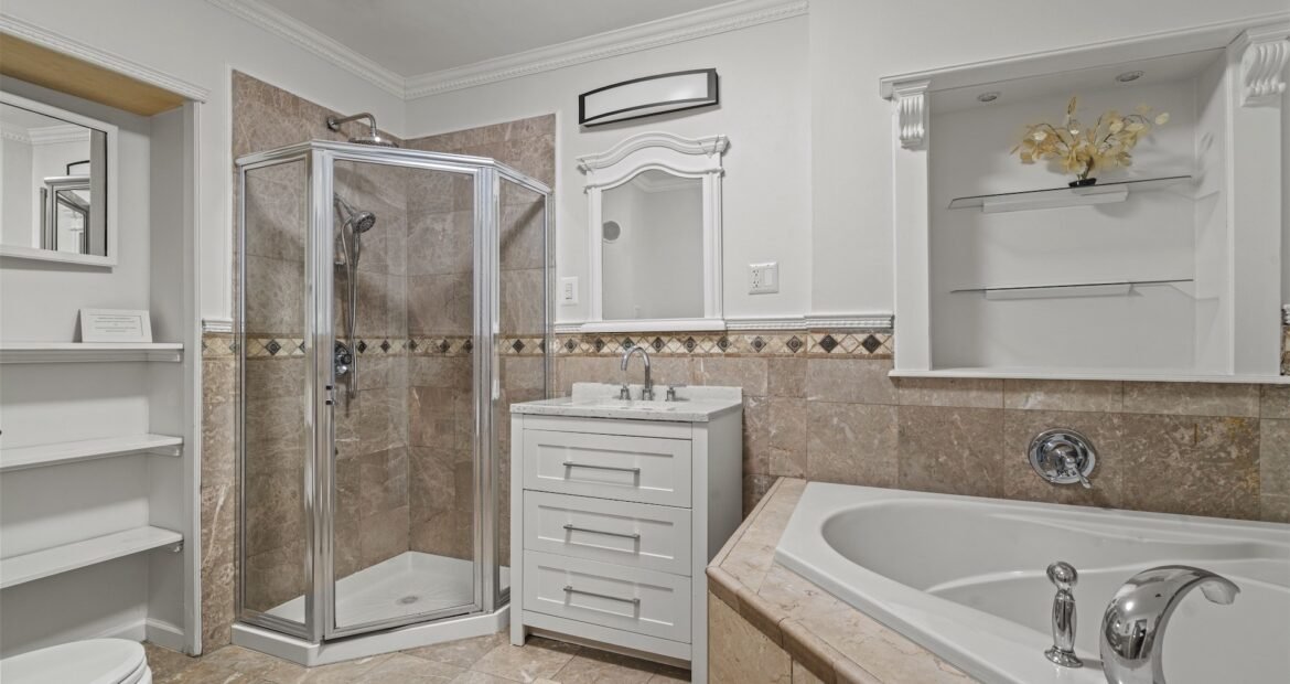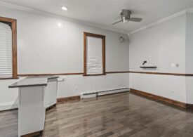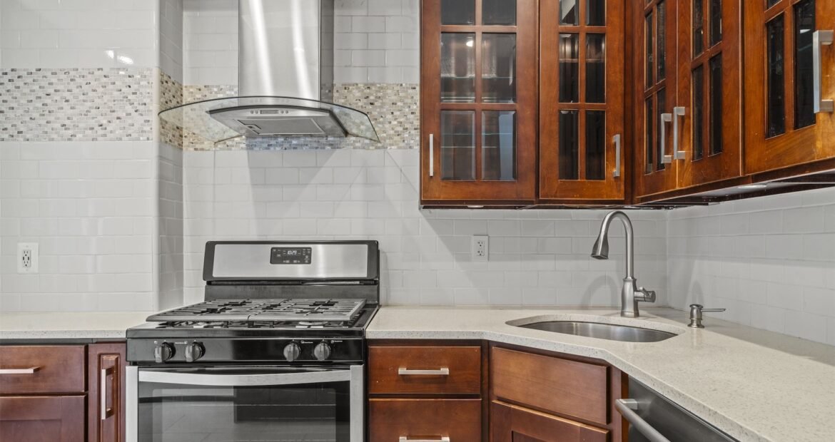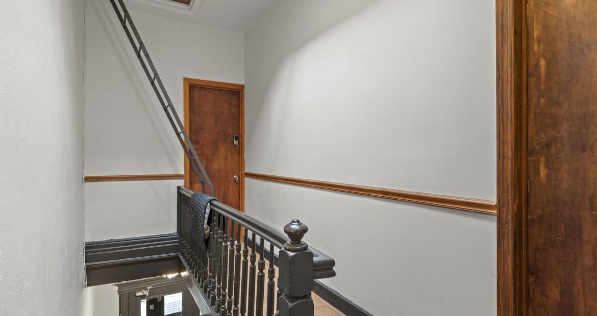 Unit 2 sits on the upper floors and carries the same level of renovation. It has hardwood floors, high ceilings, updated lighting, and a modern kitchen with stainless steel appliances and white cabinetry. The living area is bright throughout the day and the two bedrooms have clean finishes with solid window exposure. The bathroom follows the same contemporary tile design with a full tub and shower.