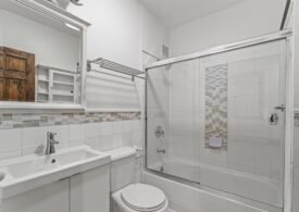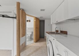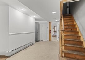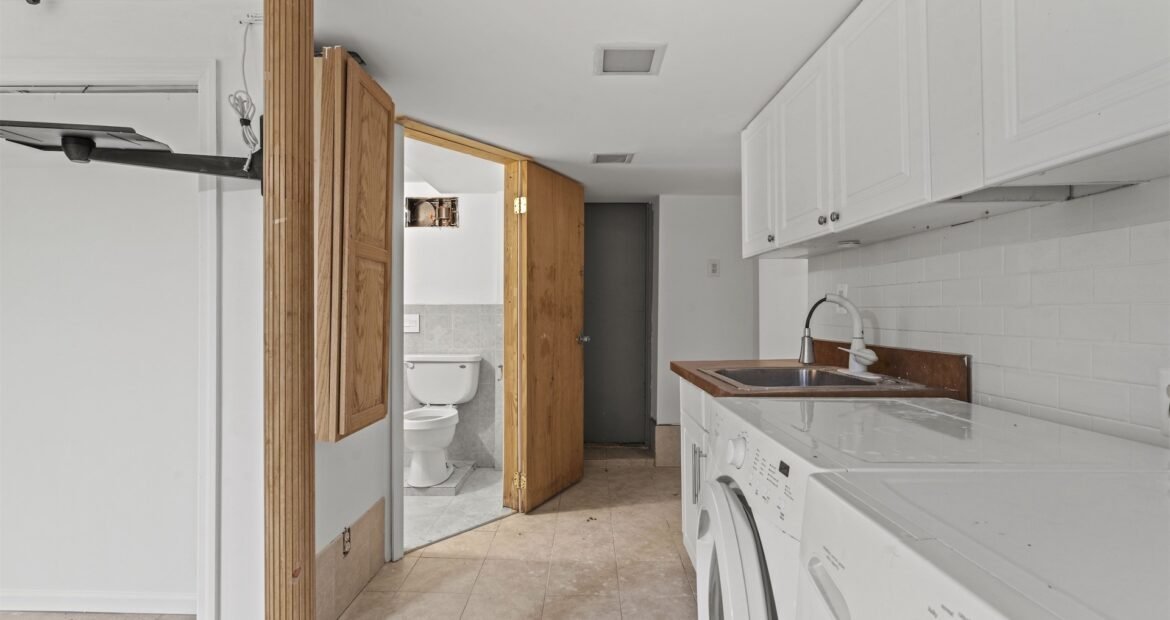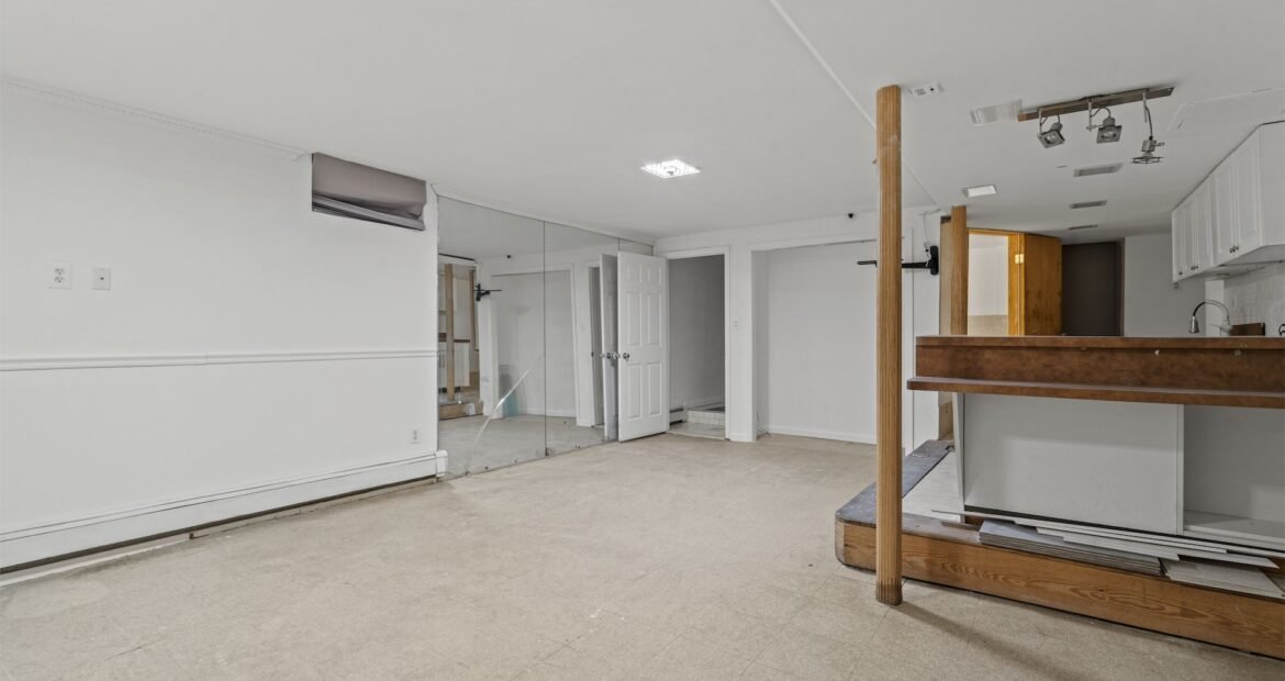 Unit 1 extends across the garden and lower levels. The main floor has hardwood floors, tall ceilings, recessed lighting, and a living area that opens naturally into the kitchen. The finishes are modern without being overdone, with stainless steel appliances, solid cabinetry, and a straightforward tile scheme. The bathroom includes a soaking tub and a glass enclosed shower. The lower level adds flexible space for recreation or storage and has a washer dryer hookup. This unit has exclusive access to the rear deck and a paved garden, which gives the home a private outdoor extension rarely found at this price point.
