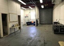 The property features high ceilings, finished offices, two bathrooms, and an overhead garage door with curb cut.