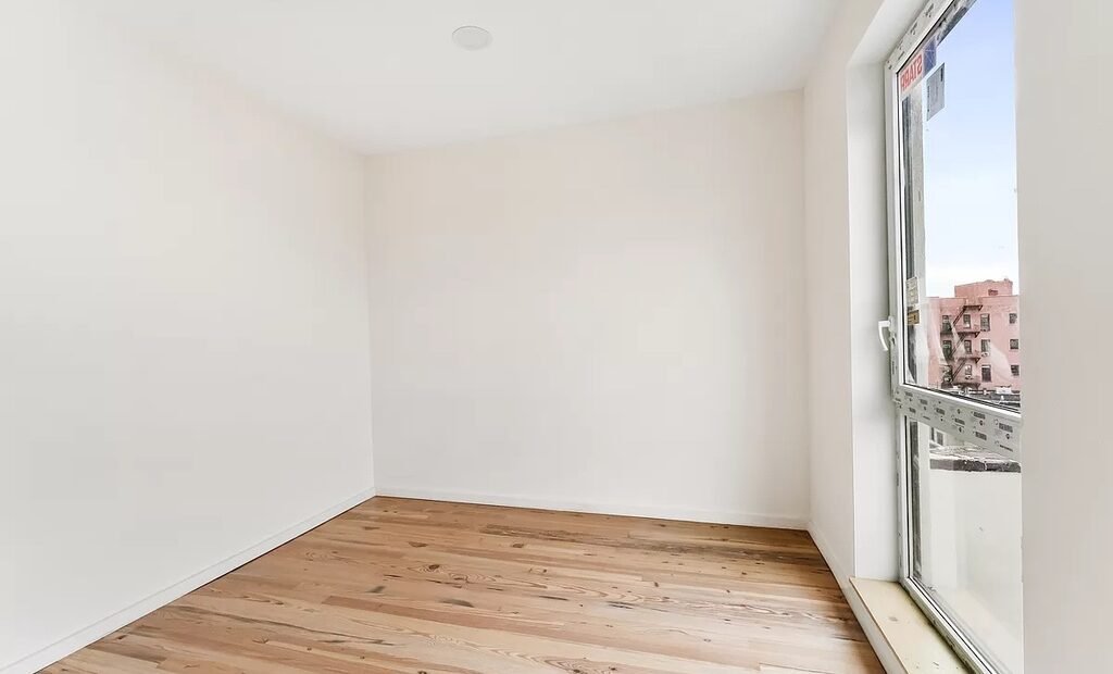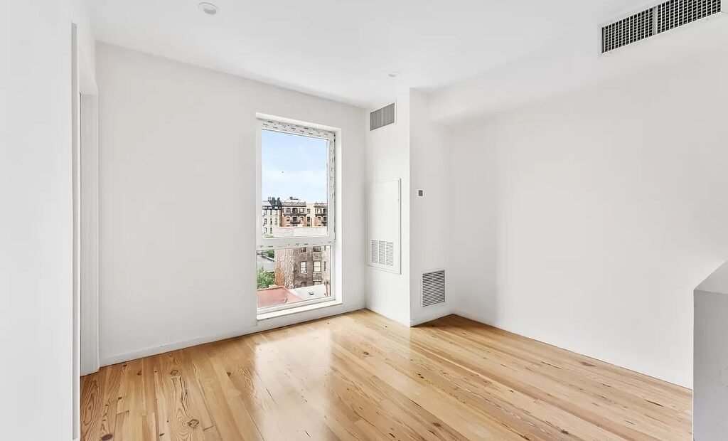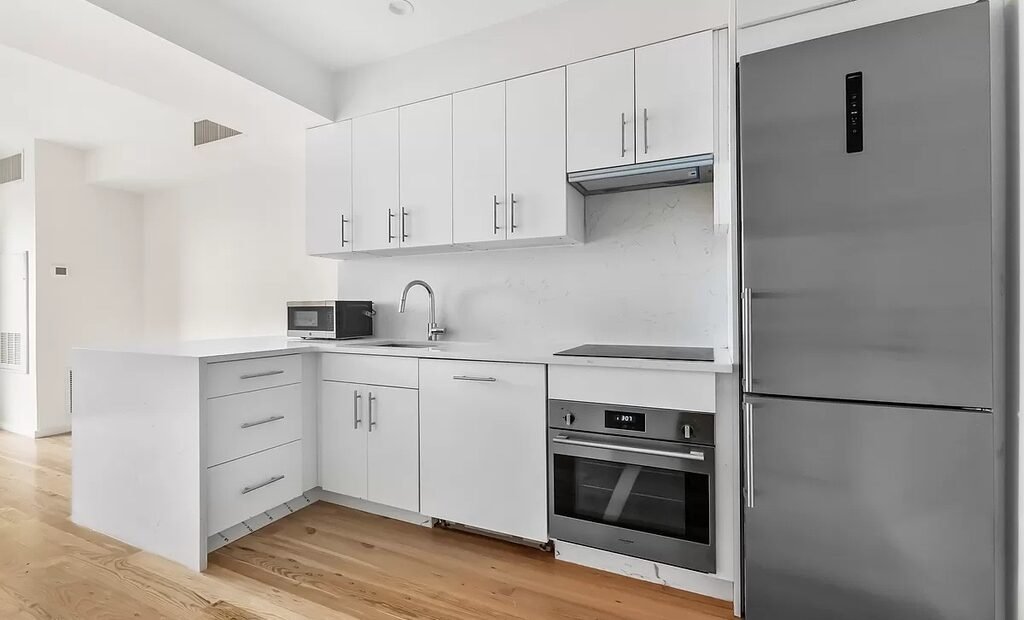 The wide-plank antique spruce wood floors throughout were repurposed from the original wood beams, removed to create the new courtyard. Apartment includes an in-unit washer/dryer and premium kitchen appliances, such as a dishwasher, induction cooktop, circulating hood, built-in oven, and microwave.