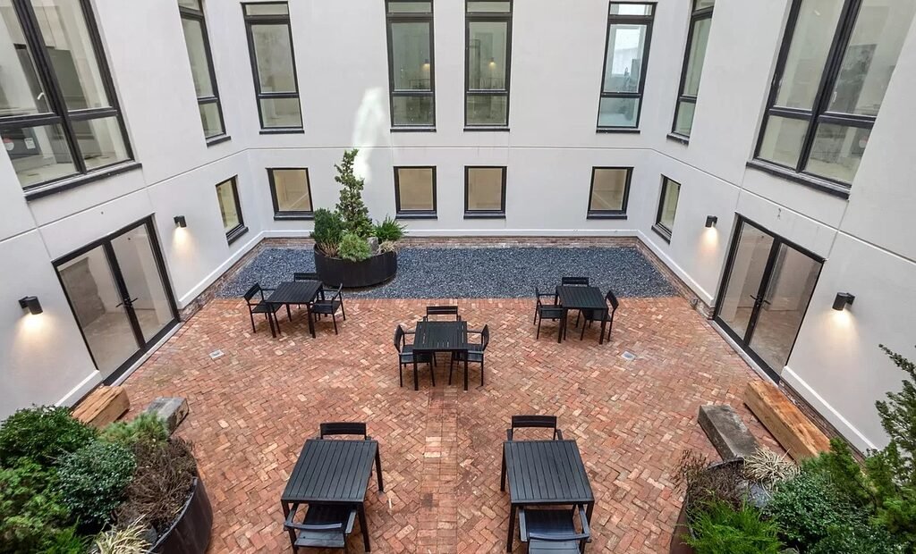 The landscaped courtyard, open to all residents during daylight hours, offers various seating arrangements perfect for reading, reflecting, or snacking. The rooftop terrace provides lounge seating and a panoramic view of the Sugar Hill district.